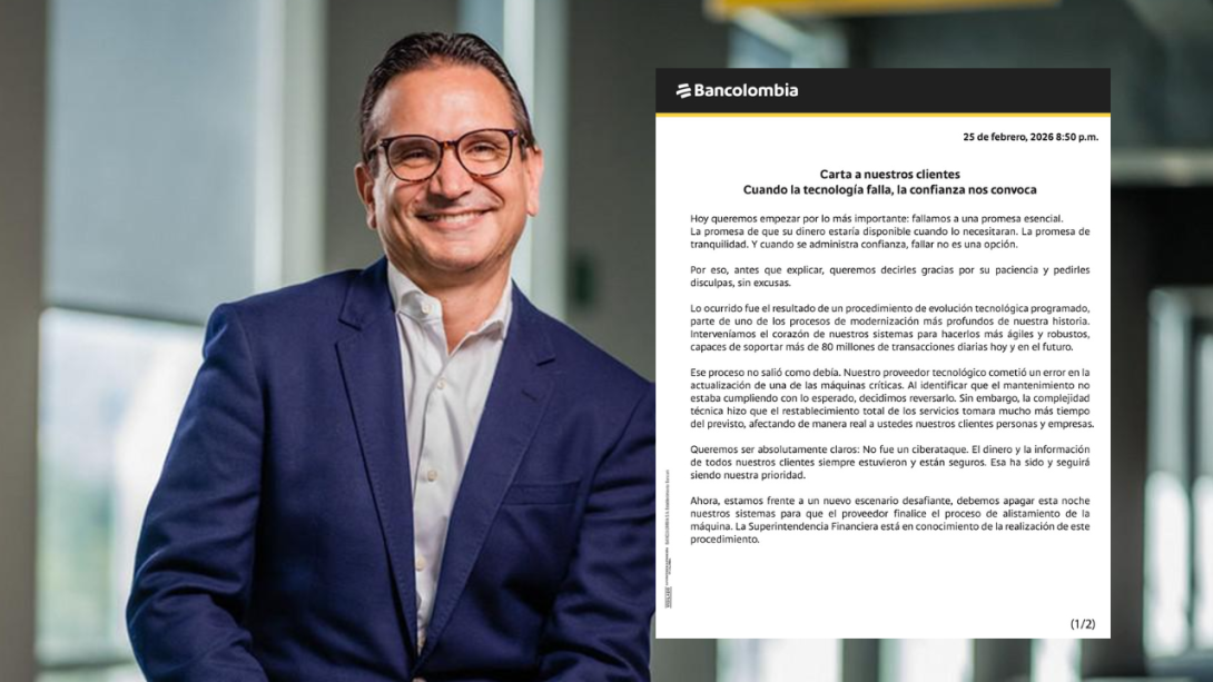 Después de varios días de intermitencias y caída de servicios financieros que afectaron a millones de personas y empresas en Colombia, Bancolombia publicó una carta oficial en la que reconoce fallas en su proceso de modernización tecnológica y anuncia nuevas inversiones para reforzar su infraestructura operativa.